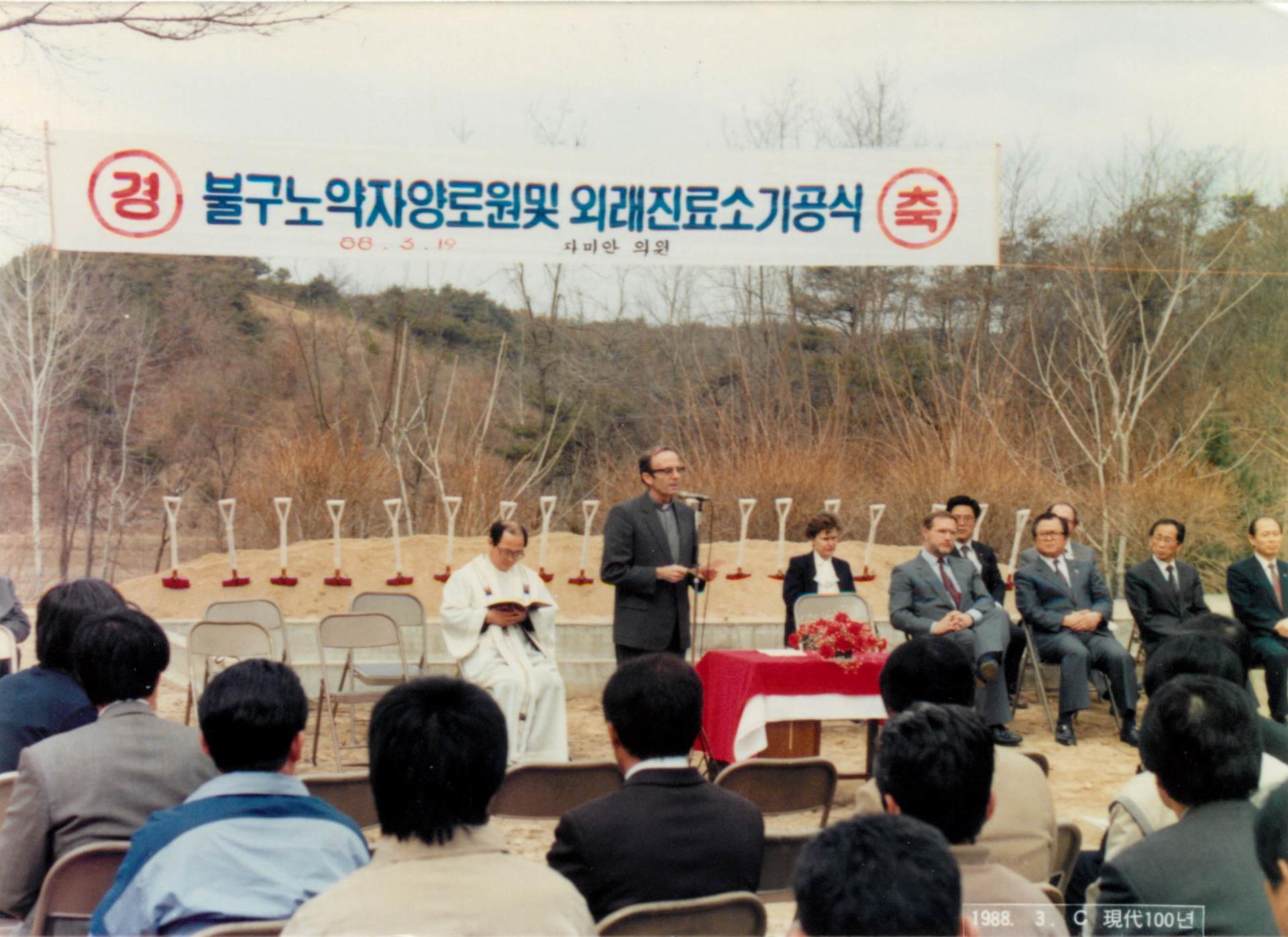 두봉 주교는 안동교구 관할지역에 나환자들을 위한 수용 시설들이 많음을 감안하여 한센인 치료와 지원을 위해서도 애를 썼다. 1970년 교구장 사목방침에 따라 한국전쟁 당시 종군 간호장교였던 데레사 캄비아 여사의 협조로 다미안 재단 한국지부를 설립하고, 나환우 정착마을들을 돕는 한편 병원과 부속건물도 만들었다. 한센인들의 입원 및 외래 환자진료, 정착마을 이동 진료를 실시하였고, 특히 외래 피부과 환자를 진료하여 새로운 환자를 조기 발견하기 위해 노력하였다.